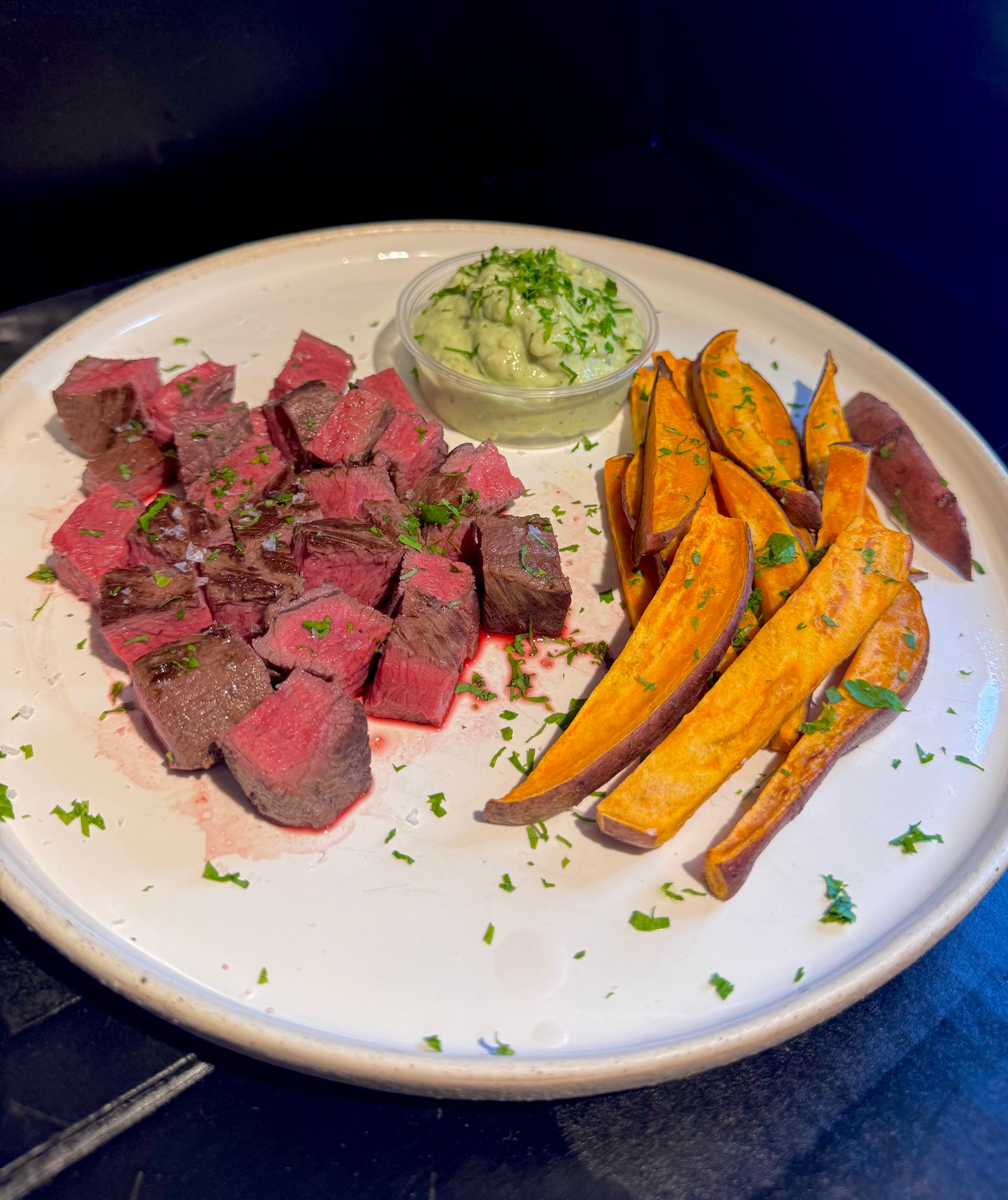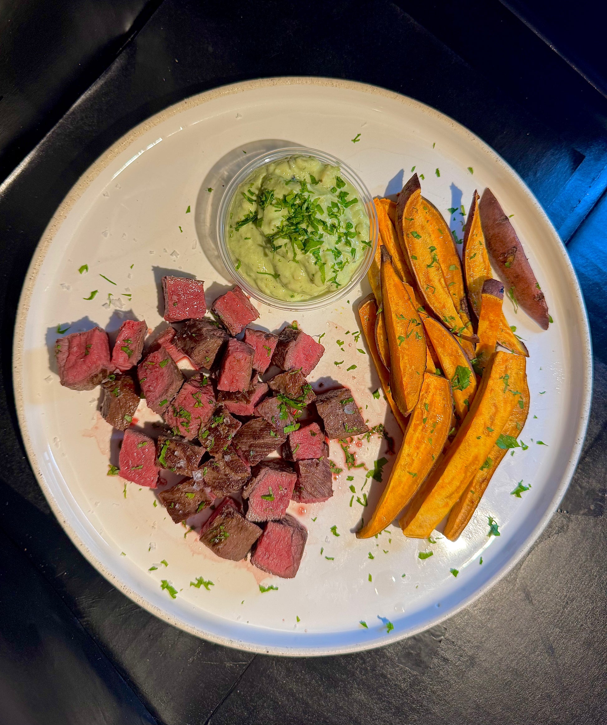 Steak with a side of hand-cut sweet potato fries. Served with a homemade gcphfitchef avocado Fit sauce.