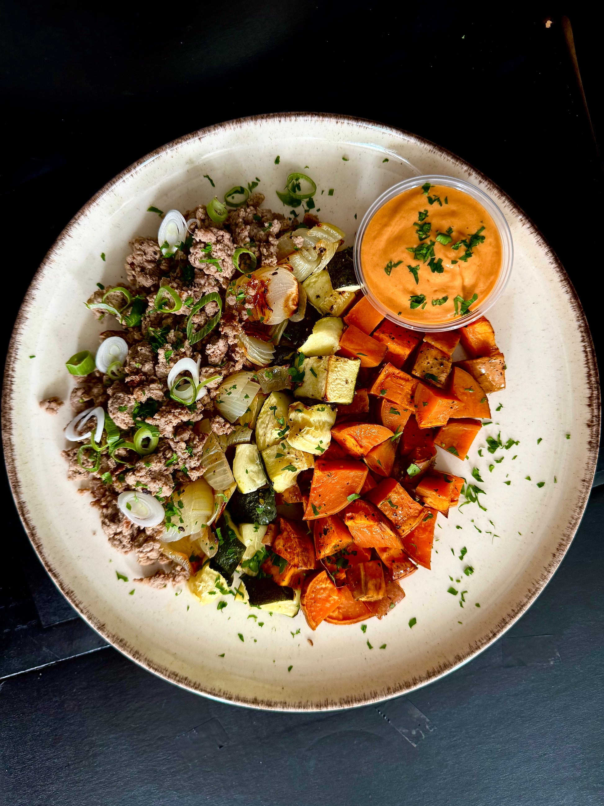 Lean ground beef, roasted sweet potatoes and veggies with a side of our homemade Fit chef Sauce.
